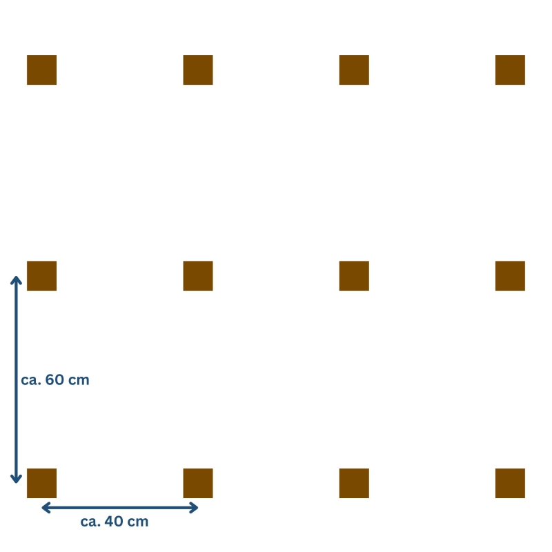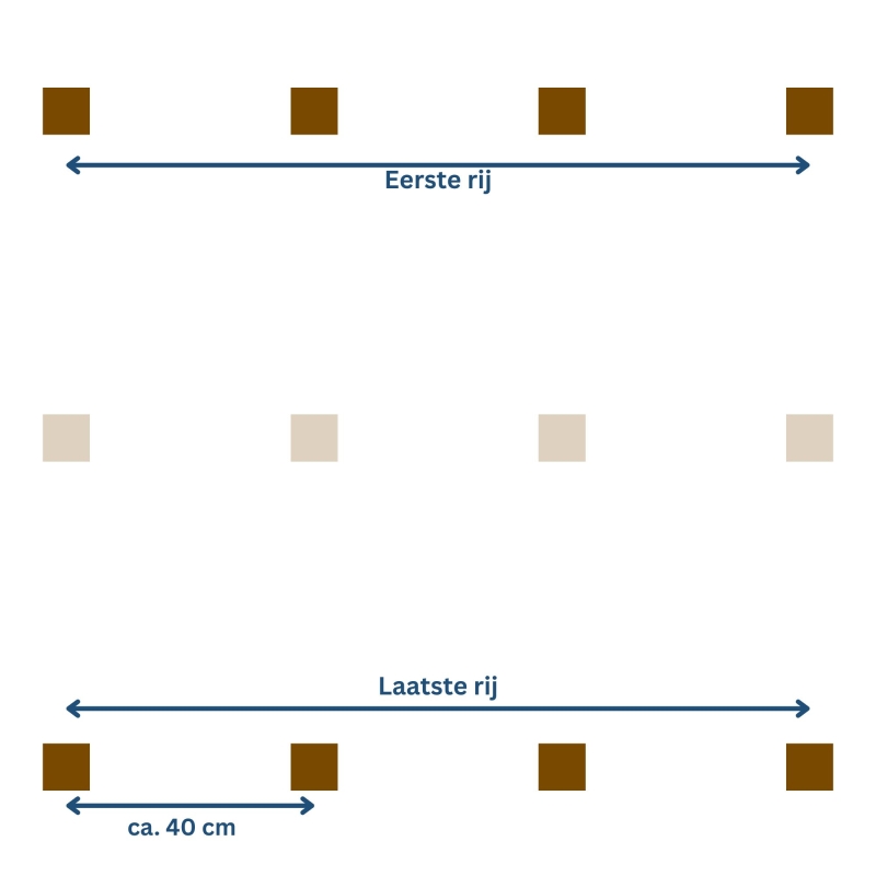 Het regelwerk moet straks ongeveer om de 40 cm (hart-op-hart) uit elkaar komen te liggen, de piketpalen komen dus ook zover uit elkaar te staan. Deze hart-op-hart afstand is wel enigzins afhankelijk van de dikte van de vlonderplanken. De meeste gebruikte vlonderplank is 21 mm, maar gebruik je een dunnere of juist dikkere vlonderplank dan kun je iets afwijken van deze afstand. Bezuinig echter niet teveel op de onderconstructie, deze zorgt voor een groot deel voor de stevigheid en de stabiliteit van de vlonder!