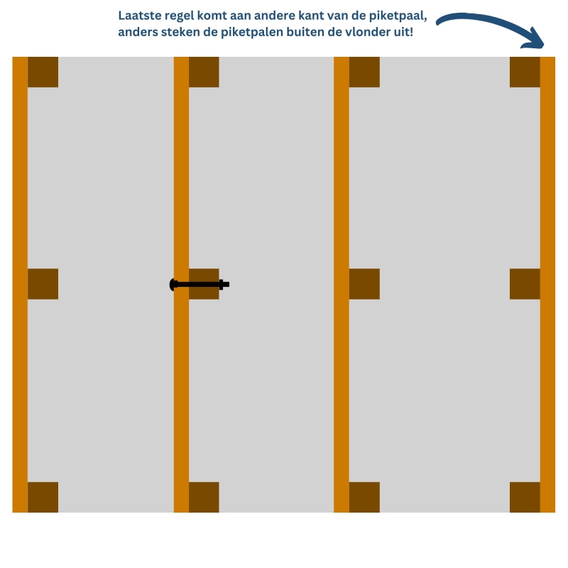 Wanneer alle piketpalen staan kunnen de regels gemonteerd worden. Dit kan met behulp van slotbouten. Boor een gat zo groot als de slotbout (of iéts groter) door de regel en de piketpaal heen. Hier gaat vervolgens de slotbout doorheen, deze kun je voorzichtig doorslaan met een hamer. Draai de moer aan met een (ring)sleutel of bahco. Doe dit bij alle piketpalen en controleer of de regels waterpas (of op afschot) liggen.