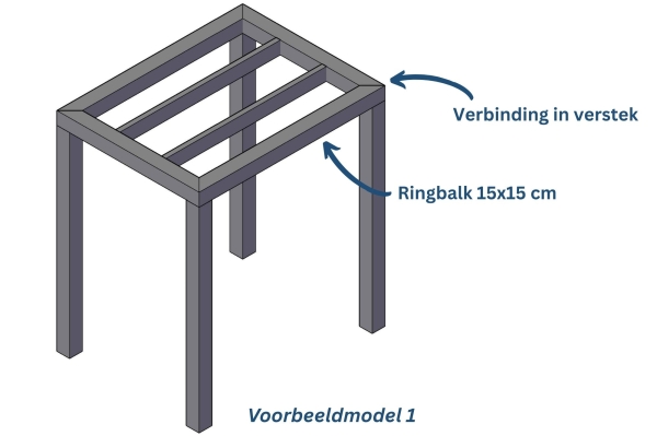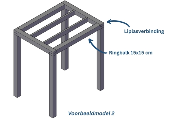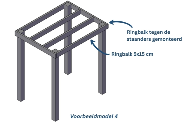 Dit model heeft een ringbalk van 15x15 cm welke met een liplasverbinding op de staanders is gemonteerd. Tussen de ringbalken zitten dakbalken van 5x15 cm.