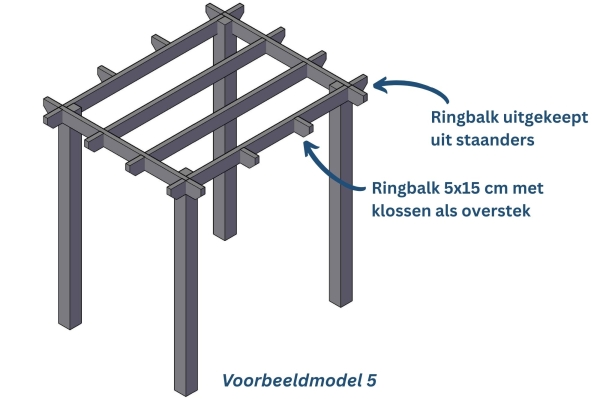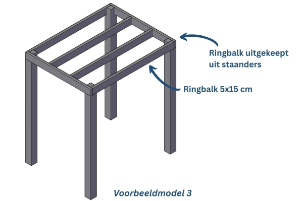 Dit model heeft een ringbalk van 15x15 cm welke in verstek op de staanders is gemonteerd. Tussen de ringbalken zitten dakbalken van 5x15 cm.