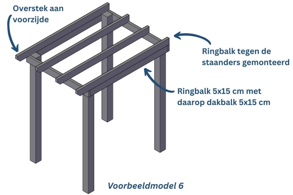 Dit model is een variatie op model 4, de dakbalken zijn nu op de staander gemonteerd en aan de voorzijde is direct een overstek gemaakt. Het voordeel hiervan is dat de dakbalken op de ringbalk liggen en de kracht daardoor rechtstreeks overgebracht kan worden in plaats van met een geschroefde verbinding. 'Nadeel' hiervan is de hoogte van het totale dakpakket, dit komt een stuk hoger te liggen dan wanneer de dakbalken tussen de ringbalk gemonteerd worden.