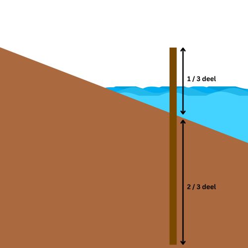 Voor een stabiele beschoeiing geldt een belangrijke vuistregel: de lengte van de palen is drie keer de hoogte van de beschoeiing. Dat betekent dat één derde van de paal boven de grond blijft en twee derde in de grond gaat. Dit is nodig omdat de palen voldoende weerstand moeten bieden tegen de gronddruk. Ga je bijvoorbeeld een beschoeiing van 60 cm hoog maken, gebruik dan palen met een lengte van minimaal 180 tot 200 cm.