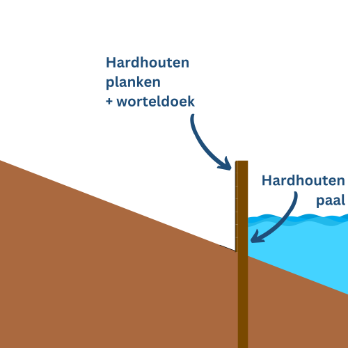 Een andere optie is het gebruik van beschoeiingsschotten. Dit zijn kant-en-klare panelen die vaak al zijn voorzien van worteldoek. Hierdoor kun je sneller werken en zijn de planken onderling al met elkaar verbonden. De schotten worden met slotbouten (of vlonderschroeven) aan de palen bevestigd.