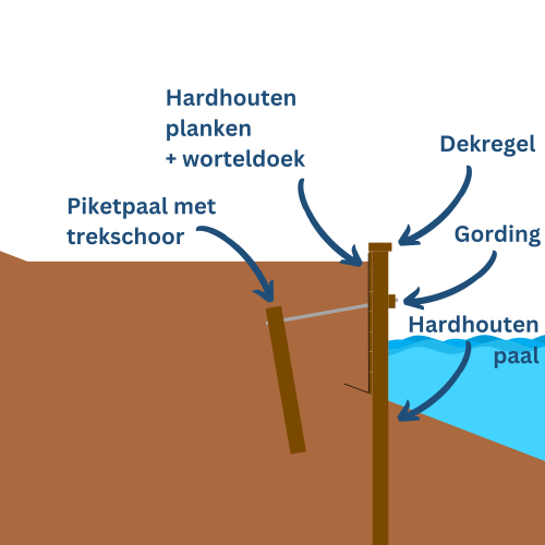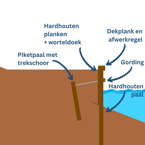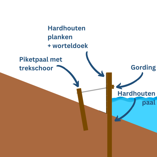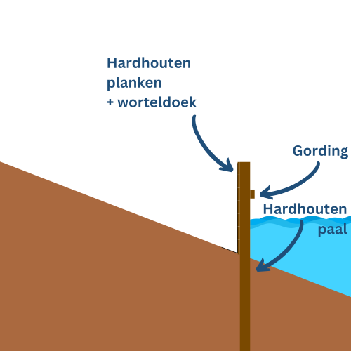 Als eerste bepaal je hoe hoog de beschoeiing moet worden, met andere woorden welk hoogteverschil je wilt overbruggen. Dit bepaalt namelijk de lengte van de palen en voor een deel ook de constructie. Gaat het bijvoorbeeld om een relatief lage beschoeiing om een tuinborder op te vangen of wil je de tuin fors ophogen door een hoge walbeschoeiing te plaatsen. In het laatste geval kan een damwand een betere optie zijn.Een beschoeiing bestaat uit een aantal onderdelen; palen, planken of schotten, gordingen en trekschoren. We lopen alle onderdelen stap voor stap langs.