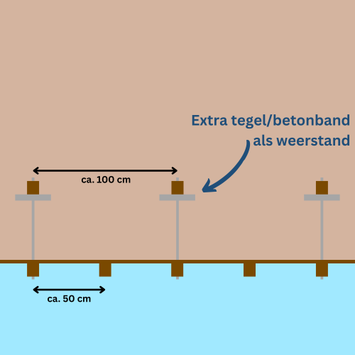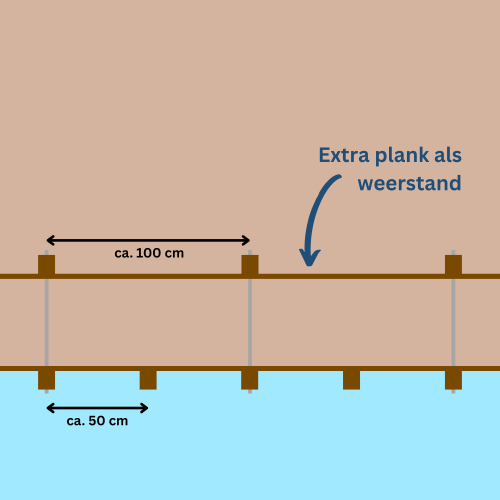 Hiervoor wordt doorgaans een hart-op-hart afstand van circa 50 cm aangehouden. Deze relatief korte afstand zorgt ervoor dat de druk gelijkmatig wordt verdeeld en voorkomt het doorbuigen van de planken.
