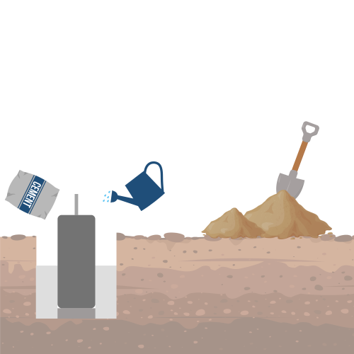 6. AanvullenWanneer de poer goed staat kun je beginnen met het dichtmaken van het gat. Onderin het gat kun je eventueel eerst een laag (snel)beton gebruiken. Vul daarna het gat laag voor laag aan met grond en stap dit tussendoor goed aan. Zo zorg je ervoor dat de betonpoer stevig staat en de grond na verloop van tijd niet teveel zal gaan verzakken.