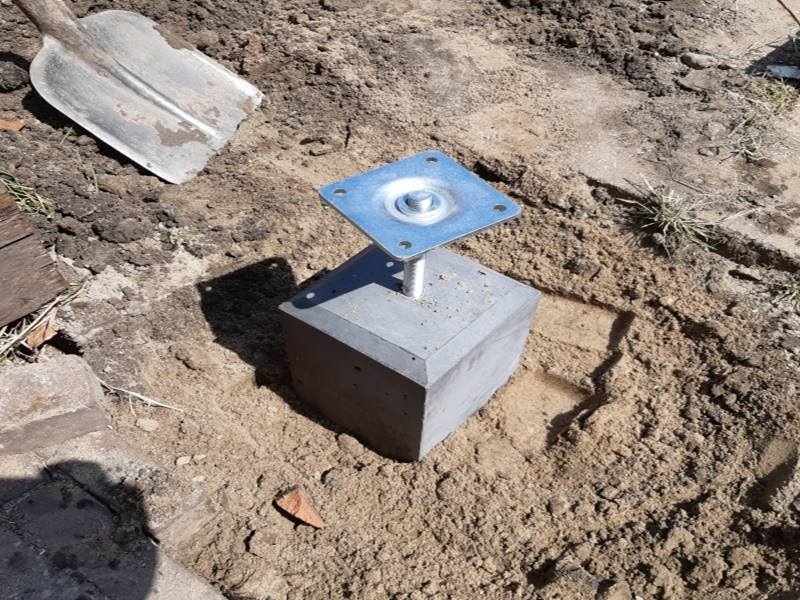 Boor een gat onderin de staanders waar straks het draadeinde in kan. Schroef de montageplaat aan de onderzijde van de staander, over het gat heen. De montageplaat kun je vervolgens over het draadeinde van de poer plaatsen. Stel de staanders met behulp van de moer op de juiste hoogte en je bent klaar om verder te bouwen aan je overkapping!