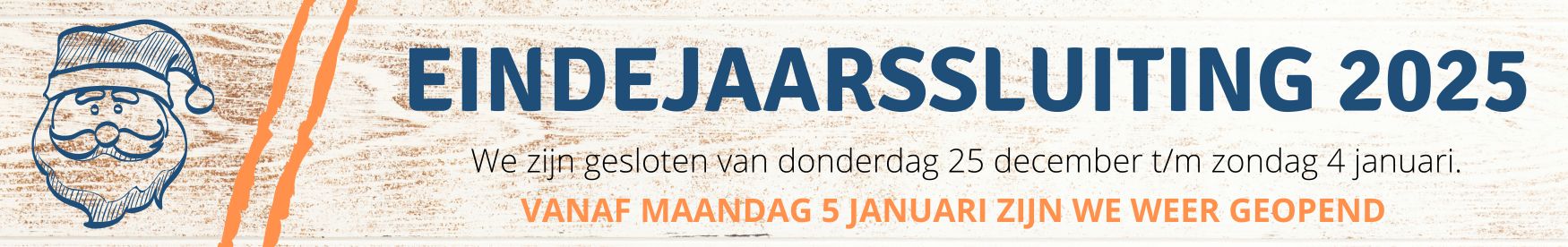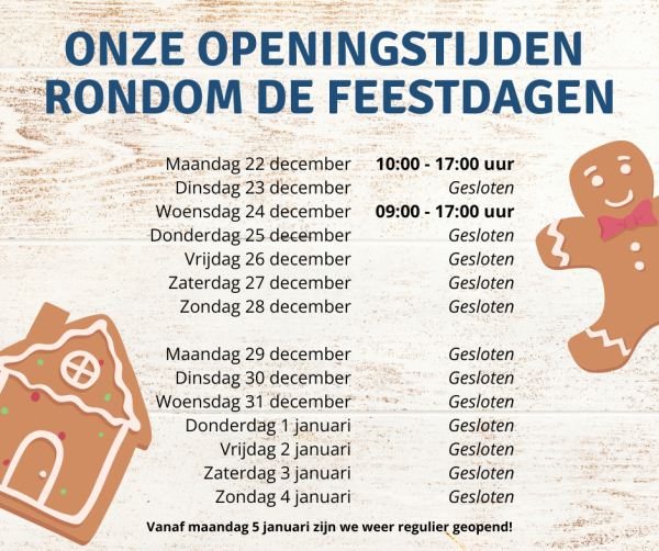 Eindejaarssluiting rondom de feestdagen: we zijn gesloten van dinsdag 24 december t/m donderdag 26 december en van maandag 30 december t/m donderdag 2 januari.